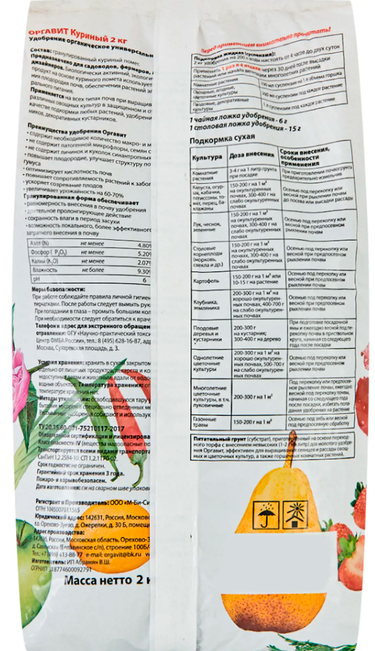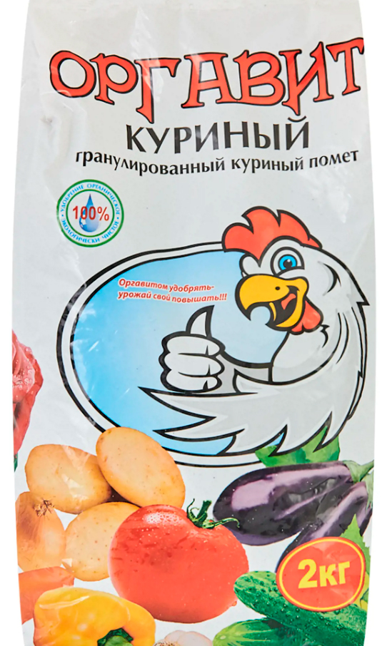 Удобрение Оргавит куриный помет 2 кгСостав: гранулированный куриный помет. макроэлементы, не менее: общий азот (N)- 4,76%; общий фосфор (Р) - 2,63%; общий калий (К) - 2,07% Влажность не более 9,3% pH- 6