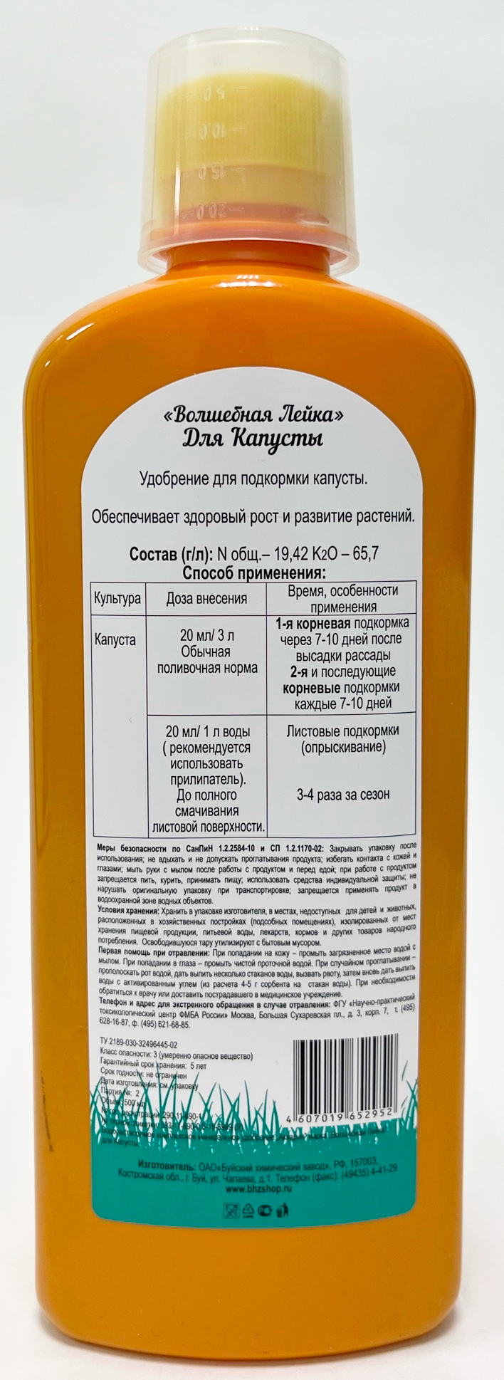 Жидкое комплексное удобрение "Волшебная лейка" для капустыСтимулирует развитие растений на всех фазах роста. Устраняет видимые проявления дефицита азота и калия, предотвращает развитие болезней, вызванных недостатком питания. Содержит большое количество калия. Он повышает лежкость плодов, поддерживает водный баланс растения, защищает от последствий перепада температур. Это удобрение подходит для различных видов капусты и актуально для внесения в течение всего периода вегетации.