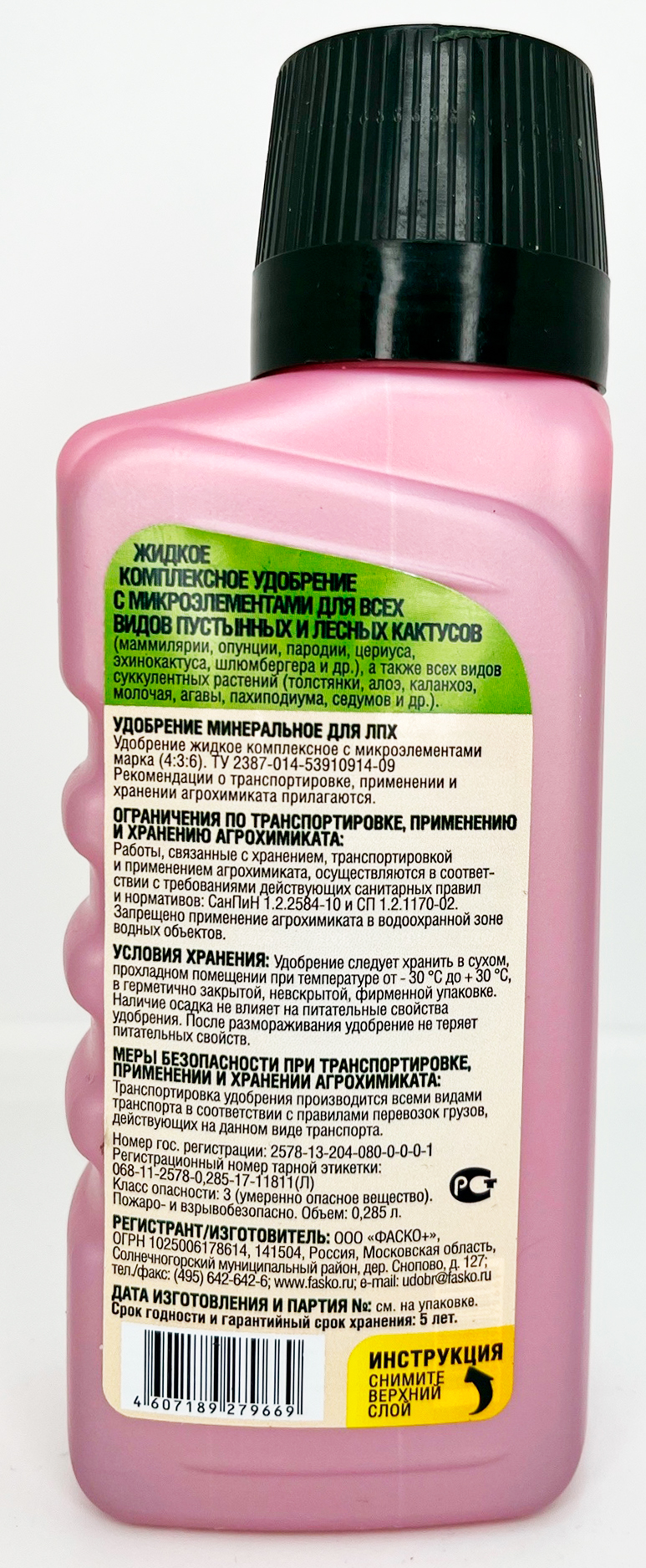 Удобрение комплексное жидкое для кактусов ФАСКО "Цветочное счастье"Специализированное комплексное жидкое удобрение с микроэлементами. Содержит сбалансированный набор питательных веществ необходимых для активного роста растений.