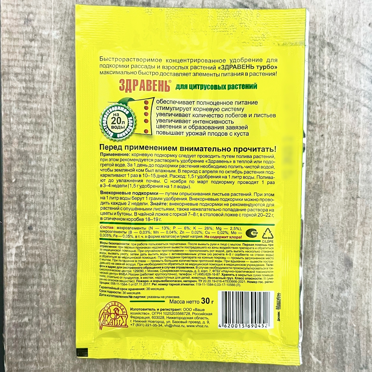 “Здравень” очень быстро растворяется в воде обычной температуры и жесткости.Ни один питательный элемент не выпадает в осадок, все они равномерно распределяются в растворе.