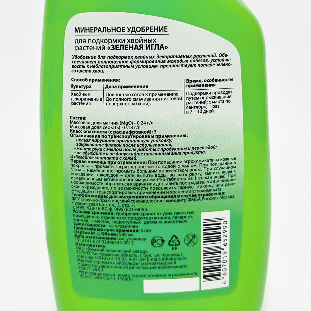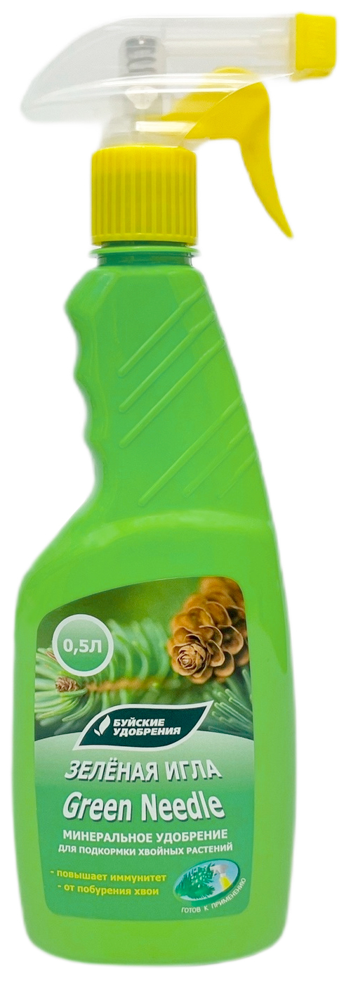 Зелёная игла Green Needle 0,5лУдобрение для подкормок хвойных декоративных растений. Обеспечивает полноценное формирование молодых побегов, устойчивость к неблагоприятным условиям, препятствует потере зеленого цвета хвои.
