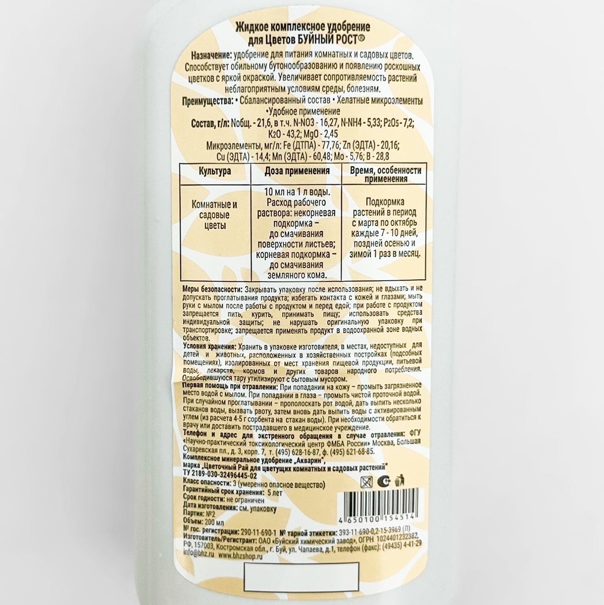 Состав, г/л: N общ. - 21,6 в т.ч. N-NO3 - 16,27, N-NН4 - 5,33, Р2О5 - 7,2, К2О - 43,2, МgО - 2,45. Микроэлементы мг/л: Fe (ДТПА) - 77,76, Zn (ЭДТА) - 20,16, Сu (ЭДТА) - 14,4, Мn (ЭДТА) - 60,48, Мо - 5,76, В - 28,8.