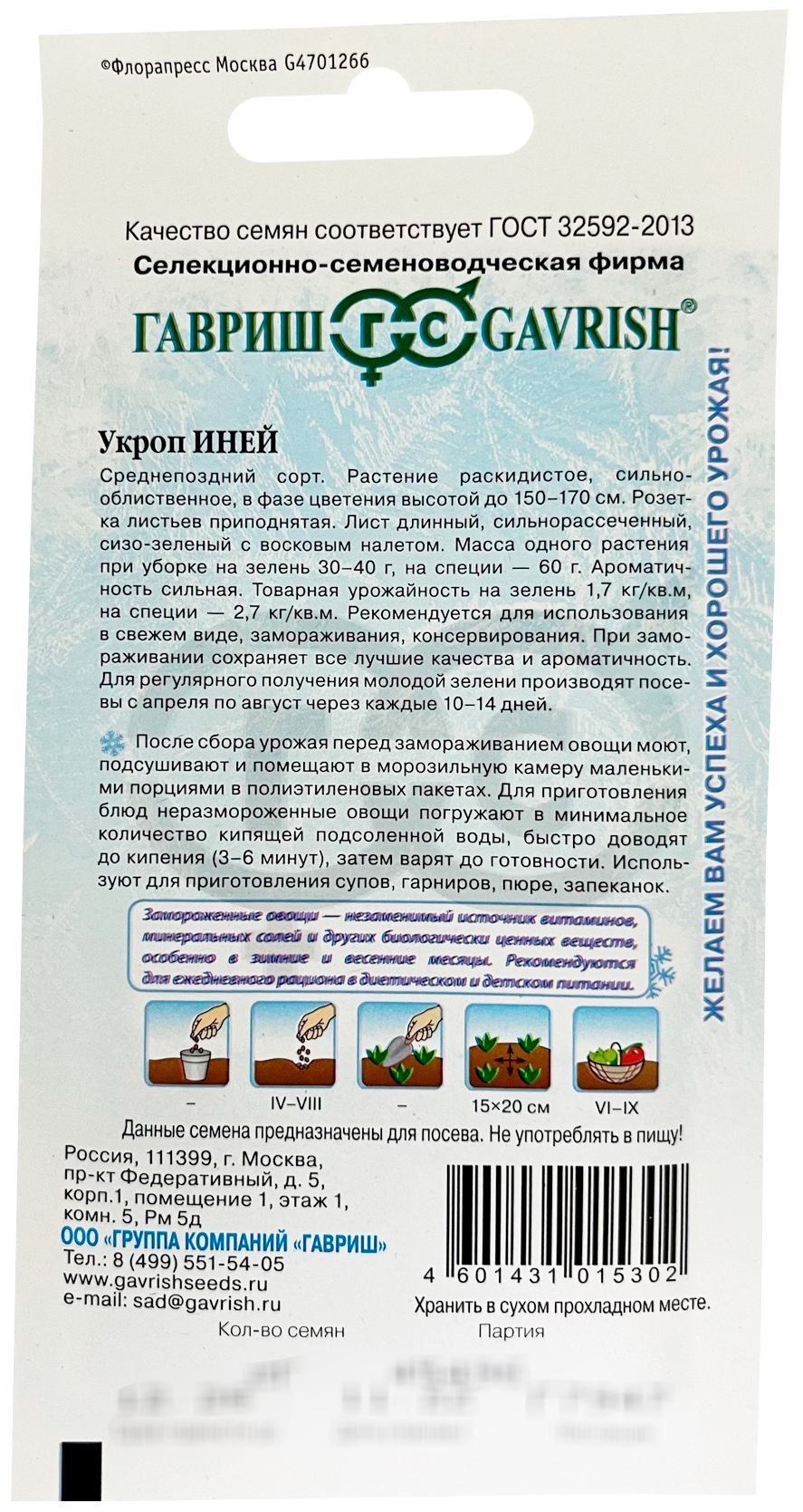 Укроп Иней серия Заморозь!Среднепоздний сорт. Розетка листьев приподнятая. Лист длинный, сизо-зеленый, сильнорассеченный с восковым налетом. Растение раскидистое, сильнооблиственное, в фазе цветения высотой до 150-170 см, с крупным зонтиком.Масса одного растения при уборке на зелень 30-40 г, на специи 60 г. Ароматичность сильная. Товарная урожайность на зелень 1,7 кг/кв.м, на специи -2,7 кг/кв.м. Рекомендуется для использования в свежем виде, замораживания, консервирования. При замораживании сохраняет все лучшие качества и ароматичность. Для регулярного получения молодой зелени производят посевы с апреля по август через каждые 10-14 дней.