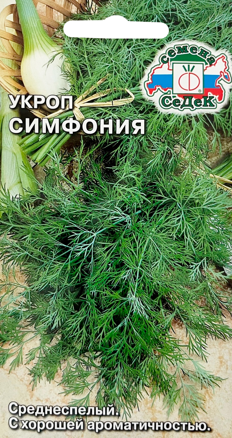 Укроп СимфонияСреднеспелый (от всходов до уборки на зелень 38-42 дня, на специи – 70-80 дней) сорт. Растение раскидистое, сильнооблиственное, в фазе цветения высотой 100-130 см. Розетка листьев полуприподнятая. Листья среднего размера, зеленые, средне рассеченные. Ароматичность хорошая. Урожайность на зелень 2,5-3,5 кг/м2. Ценность сорта: дружное формирование сочной и нежной зелени, высокое качество сильно ароматичного зонтика. Рекомендуется для сушки, замораживания, приготовления разнообразных приправ, засолки и маринования.