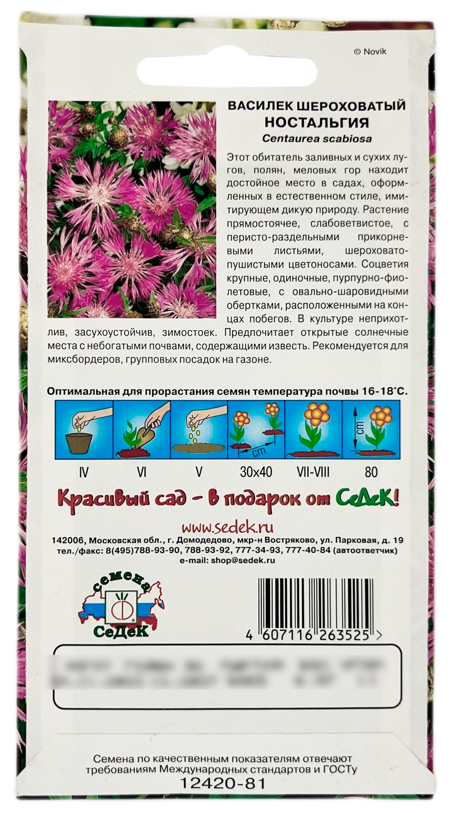 Василек Ностальгия шероховатый СеДеКЭтот обитатель заливных и сухих лугов, полян, меловых гор находит достойное место в садах, оформленных в естественном стиле, имитирующем дикую природу. Растение прямостоячее, слабоветвистое, с перисто-раздельными прикорневыми листьями, шероховато-пушистыми цветоносами. Соцветия крупные, одиночные, пурпурно-фиолетовые, с овально-шаровидными обертками, расположенными на концах побегов. В культуре неприхотлив, засухоустойчив, зимостоек. Предпочитает открытые солнечные места с небогатыми почвами, содержащими известь. Рекомендуется для миксбордеров, групповых посадок на газоне.