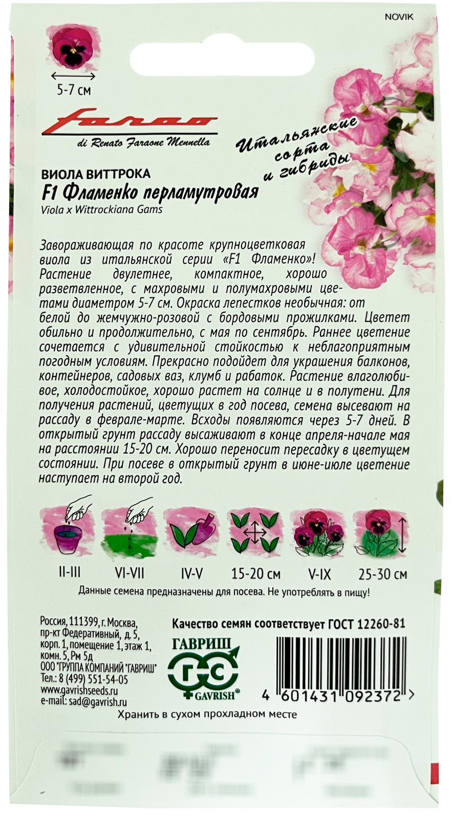 Виола Фламенко перламутровая F1, Виттрока ГАВРИШЗавораживающая по красоте крупноцветковая виола из итальянской серии «F1 Фламенко»! Растение двулетнее. Кустик компактный, хорошо разветвленный, с махровыми и полумахровыми цветами диаметром 5-7 см. Окраска лепестков необычная: от белого до жемчужно-розового с бордовыми прожилками. Цветет обильно и продолжительно с мая по сентябрь. Раннее цветение сочетается с удивительной стойкостью к неблагоприятным погодным условиям. Прекрасно подойдет для украшения балконов, контейнеров, садовых ваз, клумб и рабаток. Растение влаголюбивое, холодостойкое, хорошо растет на солнце и в полутени. Для получения растений, цветущих в год посева, семена высевают на рассаду в феврале-марте. Всходы появляются через 5-7 дней. В открытый грунт рассаду высаживают в конце апреля-начале мая на расстоянии 15-20 см. Хорошо переносят пересадку в цветущем состоянии. При посеве в открытый грунт в июне-июле, цветение наступает во второй год.