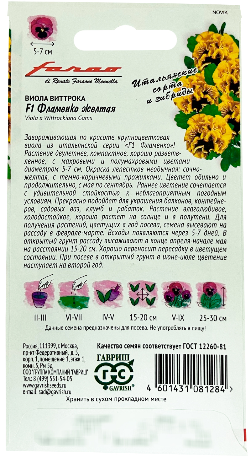 Виола Фламенко желтая F1 Виттрока ГАВРИШ (Анютины глазки)* серия Фарао (Viola x Wittrockiana Gams)Завораживающая по красоте крупноцветковая виола из итальянской серии «F1 Фламенко»! Растение двулетнее. Кустик компактный, хорошо разветвленный, с махровыми и полумахровыми цветами диаметром 5-7 см. Окраска лепестков необычная: сочно-желтая с темно-коричневыми прожилками. Цветет обильно и продолжительно с мая по сентябрь. Раннее цветение сочетается с удивительной стойкостью к неблагоприятным погодным условиям. Прекрасно подойдет для украшения балконов, контейнеров, садовых ваз, клумб и рабаток. Растение влаголюбивое, холодостойкое, хорошо растет на солнце и в полутени. Для получения растений, цветущих в год посева, семена высевают на рассаду в феврале-марте. Всходы появляются через 5-7 дней. В открытый грунт рассаду высаживают в конце апреля-начале мая на расстоянии 15-20 см. Хорошо переносят пересадку в цветущем состоянии. При посеве в открытый грунт в июне-июле, цветение наступает во второй год.