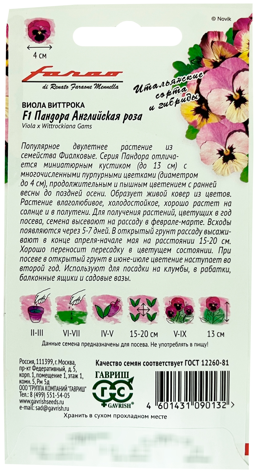 Виола Пандора Английская Роза F1 серия Фарао Н18 (Viola x Wittrockiana Gams)Популярное двулетнее растение из семейства Фиалковые. Серия Пандора отличается миниатюрным кустиком (до 13 см) с многочисленными желто-розовыми с глазком цветками (диаметром до 4 см), продолжительным и пышным цветением с ранней весны до поздней осени. Образует живой ковер из цветов. Растение влаголюбивое, холодостойкое, хорошо растет на солнце и в полутени. Для получения растений, цветущих в год посева, семена высевают на рассаду в феврале-марте. Всходы появляются через 5-7 дней. В открытый грунт рассаду высаживают в конце апреля-начале мая на расстоянии 15-20 см. Хорошо переносят пересадку в цветущем состоянии. При посеве в открытый грунт в июне-июле, цветение наступает во второй год. Используют для посадки на клумбы, в рабатки, балконные ящики и садовые вазы.
