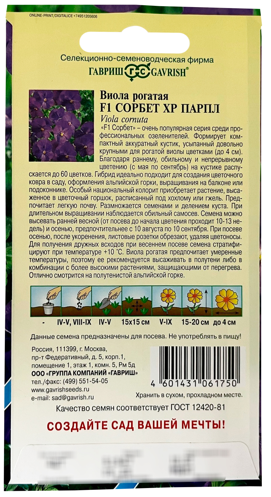 Виола Сорбет XP Парпл F1 рогатая Анютины глазки ГАВРИШ«F1 Сорбет» - очень популярная серия среди профессиональных озеленителей. Формирует компактный аккуратный кустик, усыпанный довольно крупными для рогатой виолы цветками (до 4 см). Благодаря раннему, обильному и непрерывному цветению (с мая по сентябрь) на кустике распускается до 60 цветков. Гибрид идеально подходит для создания цветочного ковра в саду, оформления альпийской горки, выращивания на балконе или подоконнике. Особый национальный колорит приобретает растение, высаженное в цветочный горшок, расписанный под хохлому или гжель. Предпочитает легкую почву. Размножается семенами и делением куста. При длительном выращивании наблюдается обильный самосев. Семена можно высевать ранней весной (от посева до начала цветения проходит 10-13 недель) и осенью, предпочтительнее с 10 августа по 10 сентября. При посеве осенью, после укоренения, листовые розетки обрезают, удаляя цветоносы. Для получения дружных всходов при весеннем посеве семена стратифицируют при температуре +10оС. Виола рогатая предпочитает умеренные температуры, поэтому ее рекомендуется высаживать в полутени, либо в комбинации с более высокими растениями, защищающими от перегрева. Отлично смотрится на полутенистой альпийской горке.
