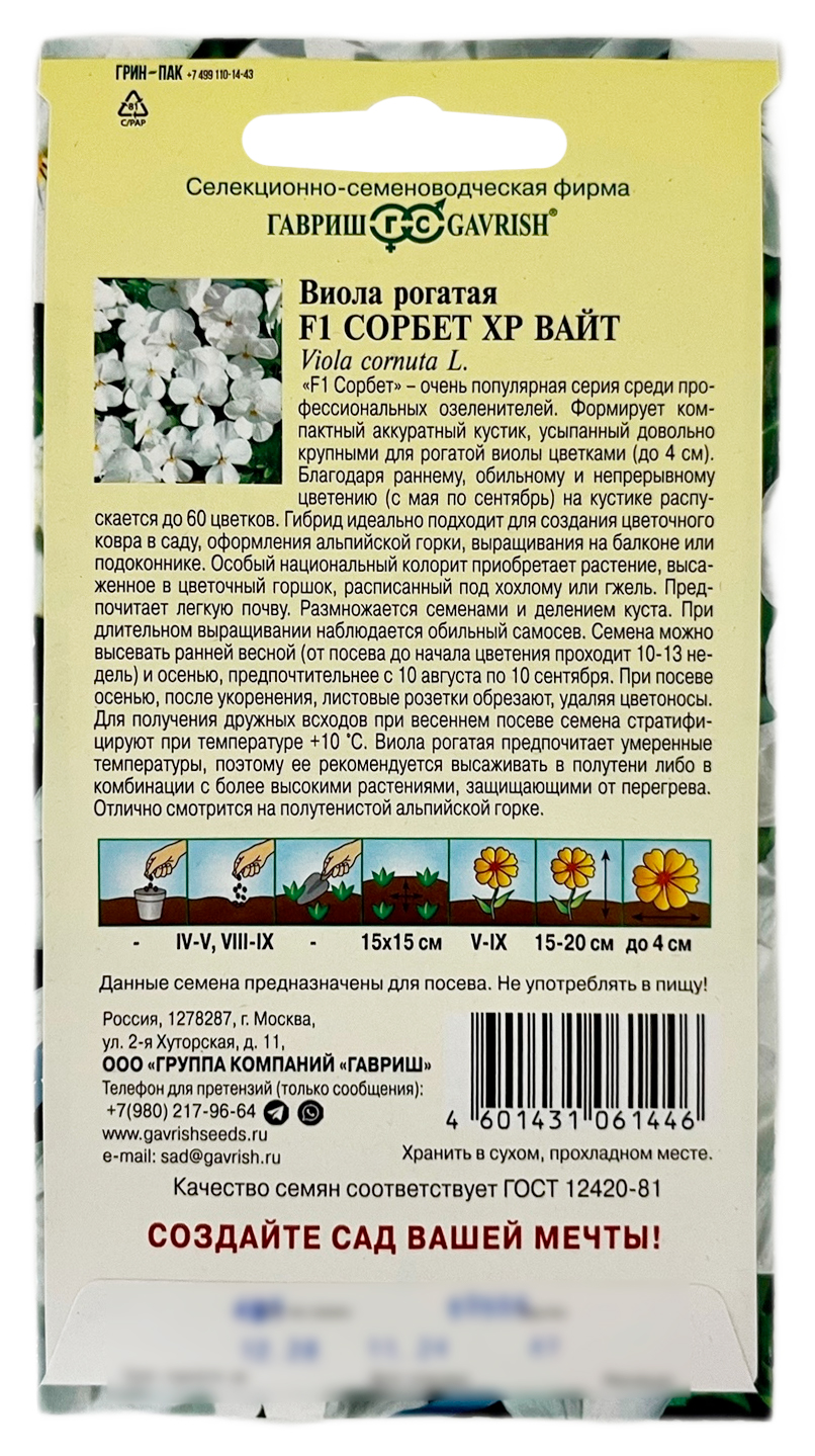 Виола рогатая F1 СОРБЕТ ХР ВАЙТ ГАВРИШ«F1 Сорбет» — очень популярная серия среди профессиональных озеленителей. Формирует компактный аккуратный кустик, усыпанный довольно крупными для рогатой виолы цветками (до 4 см). Благодаря раннему, обильному и непрерывному цветению (с мая по сентябрь) на кустике распускается до 60 цветков. Гибрид идеально подходит для создания цветочного ковра в саду, оформления альпийской горки, выращивания на балконе или подоконнике. Особый национальный колорит приобретает растение, высаженное в цветочный горшок, расписанный под хохлому или гжель. Предпочитает легкую почву. Размножается семенами и делением куста. При длительном выращивании наблюдается обильный самосев. Семена можно высевать ранней весной (от посева до начала цветения проходит 10-13 недель) и осенью, предпочтительнее с 10 августа по 10 сентября. При посеве осенью, после укоренения, листовые розетки обрезают, удаляя цветоносы. Для получения дружных всходов при весеннем посеве семена стратифицируют при температуре +10оС. Виола рогатая предпочитает умеренные температуры, поэтому ее рекомендуется высаживать в полутени, либо в комбинации с более высокими растениями, защищающими от перегрева. Отлично смотрится на полутенистой альпийской горке.