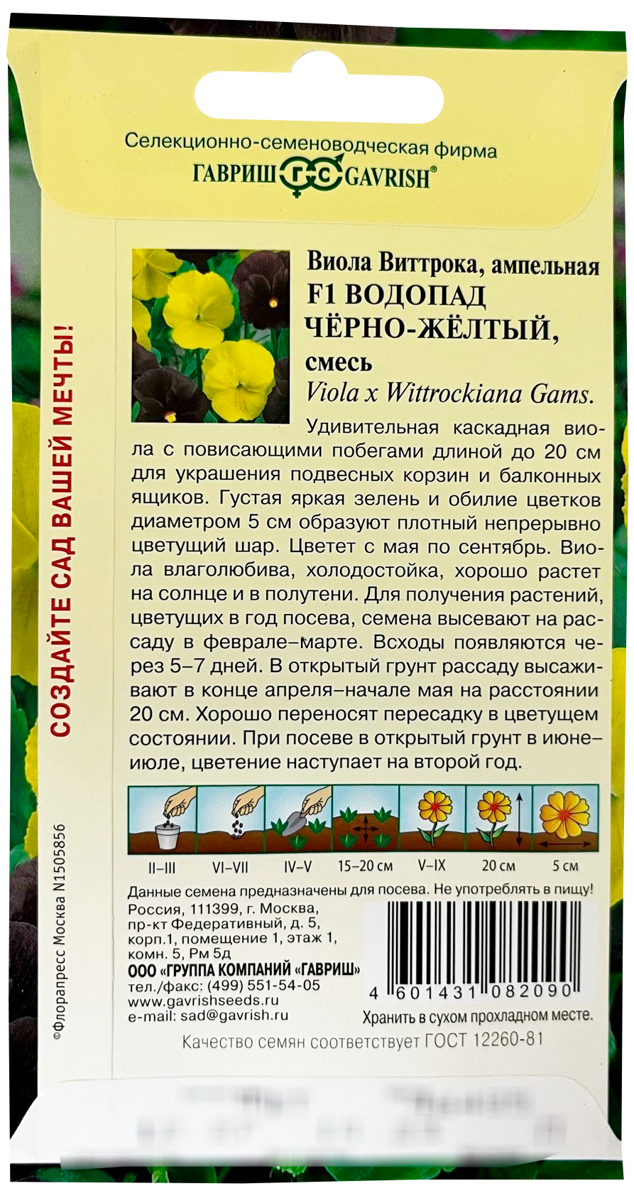 Виола Виттрока Водопад черно-желтый F1 ГАВРИШУдивительная каскадная виола с повисающими побегами длиной до 20 см для украшения подвесных корзин и балконных ящиков. Густая яркая зелень и обилие цветков диаметром 5 см образуют плотный непрерывно цветущий шар. Цветет с мая по сентябрь. Виола влаголюбива, холодостойка, хорошо растет на солнце и в полутени. Для получения растений, цветущих в год посева, семена высевают на рассаду в феврале-марте. Всходы появляются через 5-7 дней. В открытый грунт рассаду высаживают в конце апреля-начале мая на расстоянии 20 см. Хорошо переносят пересадку в цветущем состоянии. При посеве в открытый грунт в июне-июле, цветение наступает на второй год.