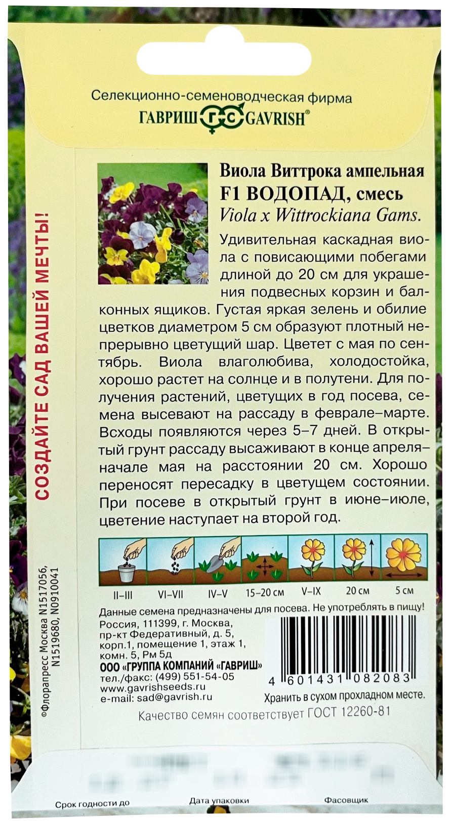 Виола Виттрока ампельная F1 Водопад смесь ГАВРИШУдивительная каскадная виола с повисающими побегами длиной до 20 см для украшения подвесных корзин и балконных ящиков. Густая яркая зелень и обилие цветков диаметром 5 см образуют плотный непрерывно цветущий шар. Цветет с мая по сентябрь. Виола влаголюбива, холодостойка, хорошо растет на солнце и в полутени. Для получения растений, цветущих в год посева, семена высевают на рассаду в феврале-марте. Всходы появляются через 5-7 дней. В открытый грунт рассаду высаживают в конце апреля-начале мая на расстоянии 20 см. Хорошо переносят пересадку в цветущем состоянии. При посеве в открытый грунт в июне-июле, цветение наступает на второй год.