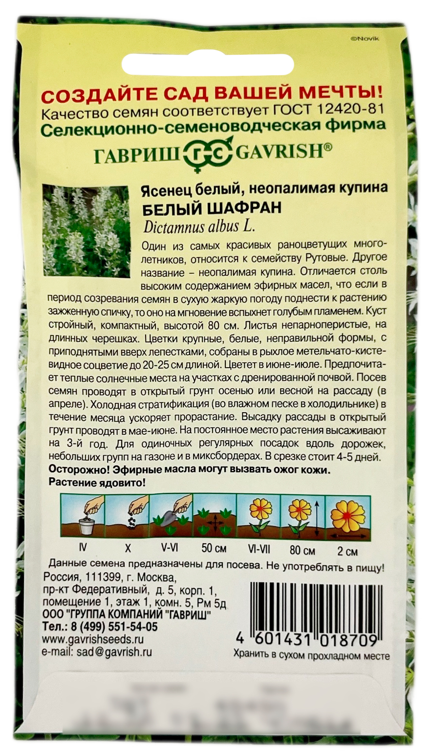 Ясенец белый, неопалимая купина БЕЛЫЙ ШАФРАНОдин из самых красивых раноцветущих многолетников, относится к семейству Рутовые. Другое название - неопалимая купина. Отличается тсоль высоким содержанием эфирных масел, что если в период созревания семян, в сухую жаркую погоду поднести к растению зажженную спичку, оно на мгновение вспыхнет голубым пламенем. Куст стройный, компактный, высотой 80 см. Листья непарно-перистые, на длинных черешках. Цветки крупные, белые, неправильной формы, с приподнятыми вверх лепестками; собраны в рыхлое метельчато-кистевидное соцветие до 20-25 см длиной. Цветет в июне-июле. Предпочитает теплые солнечные места на участках с дренированной почвой. Посев семян производят в открытый грунт осенью или весной на рассаду в апреле. Холодная стратификация (во влажном песке в холодильнике) в течение месяца ускоряет прорастание. Высадку рассады в открытый грунт проводят в мае-июне. На постоянное место растения высаживают на 3-й год.