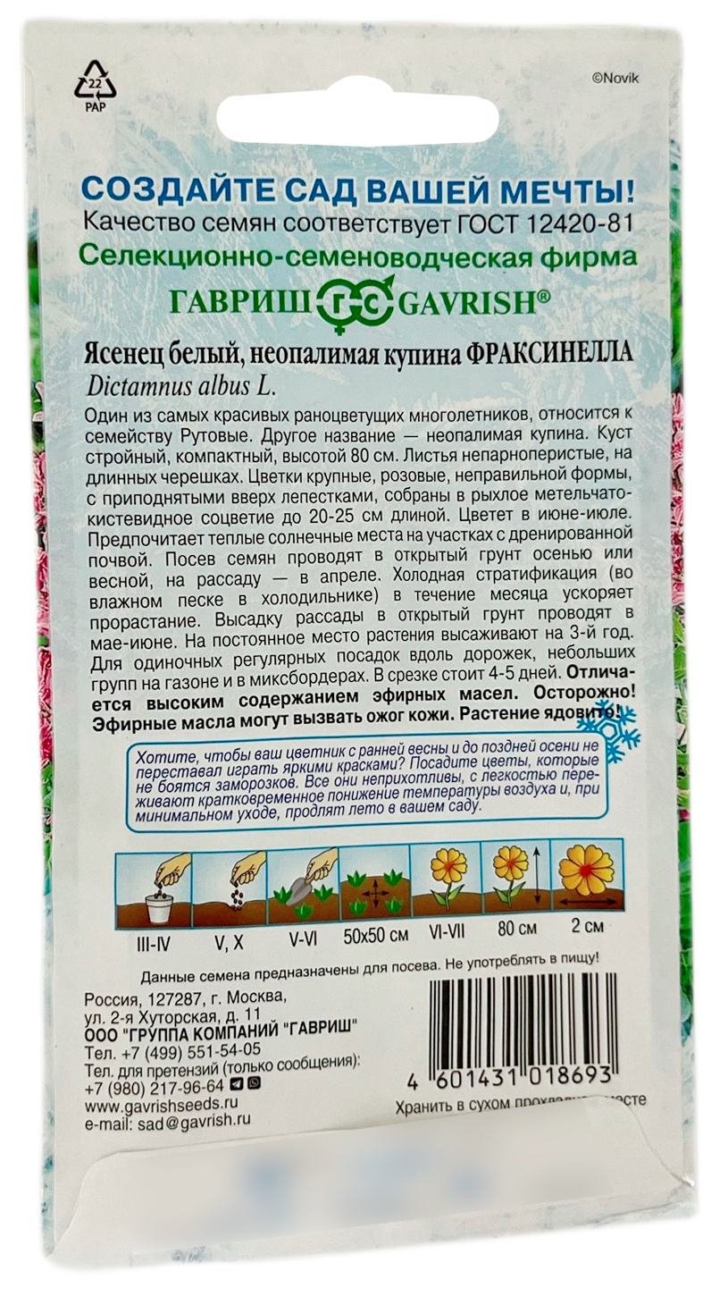 Ясенец белый неопалимая купина ФРАКСИНЕЛЛА ГАВРИШОдин из самых красивых раноцветущих многолетников, относится к семейству Рутовые. Другое название - неопалимая купина. Отличается столь высоким содержанием эфирных масел, что если в период созревания семян, в сухую жаркую погоду поднести к растению зажженную спичку, оно на мгновение вспыхнет голубым пламенем. Куст стройный, компактный, высотой 80 см. Листья непарно-перистые, на длинных черешках. Цветки крупные, розовые, неправильной формы, с приподнятыми вверх лепестками; собраны в рыхлое метельчато-кистевидное соцветие до 20-25 см длиной. Цветет в июне-июле. Предпочитает теплые солнечные места на участках с дренированной почвой. Посев семян производят в открытый грунт осенью или весной на рассаду в апреле. Холодная стратификация (во влажном песке в холодильнике) в течение месяца ускоряет прорастание. Высадку рассады в открытый грунт проводят в мае-июне. На постоянное место растения высаживают на 3-й год.