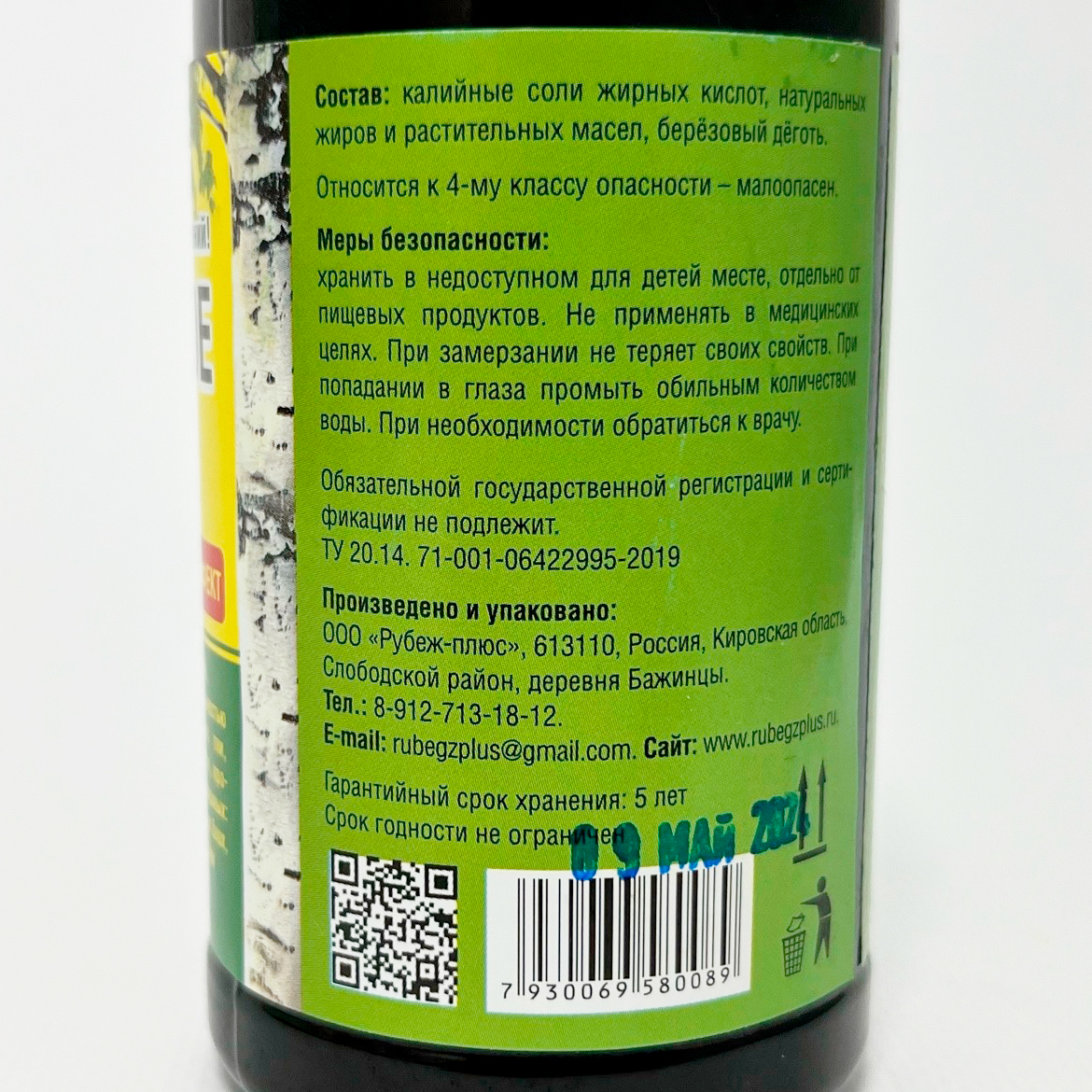 Состав: калийные соли жирных кислот, натуральных жиров и растительных масел, берёзовый дёготь.