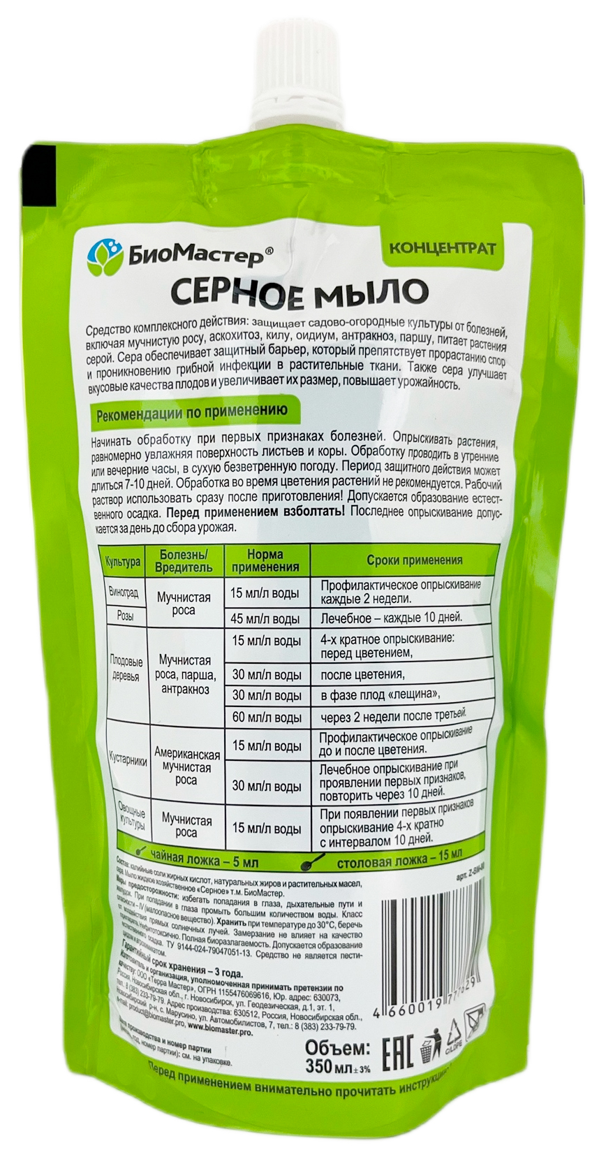 Серное мыло 350мл БиоМастерСерное мыло – это одновременно фунгицид, акарицид и средство для внекорневой подкормки растений.