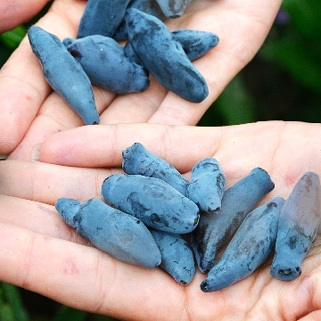 Жимолость камчатская Восторг Lonicera kamtschatica Vostorg Куст сильнорослый. Ягоды очень крупные (1,6-2,8 г), широко-веретеновидной формы. Вкус ягод очень гармоничный, кисло-сладкий. Срок созревания ранний. Созревание дружное. Осыпание слабое. Зимостойкость высокая.Характеристики
