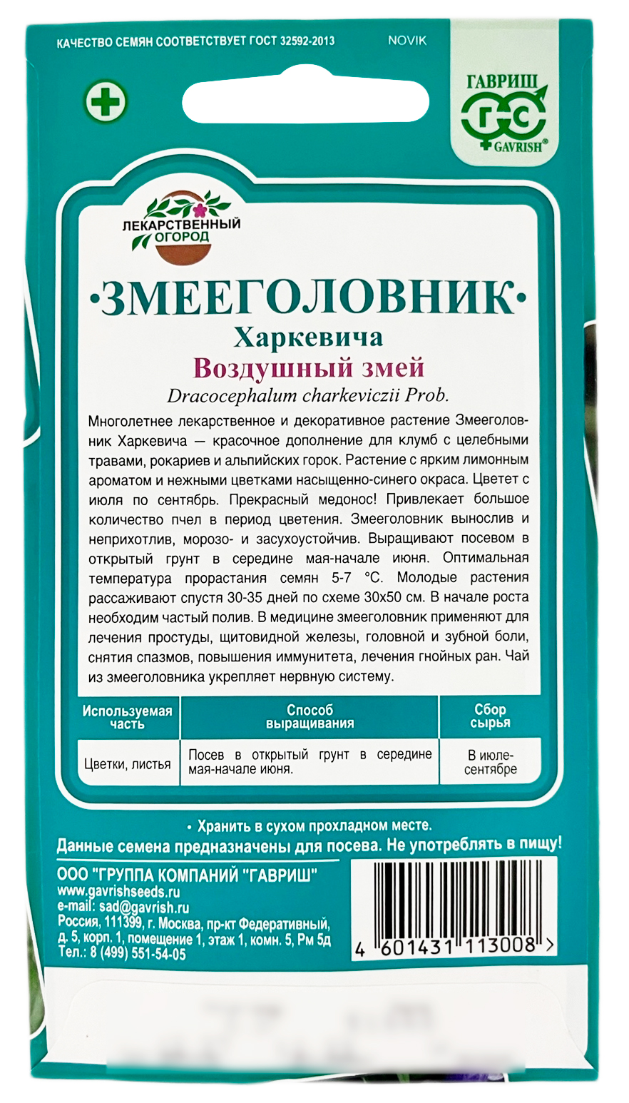 Змееголовник харкевича ВОЗДУШНЫЙ ЗМЕЙ ГАВРИШМноголетнее лекарственное и декоративное растение Змееголовник Харкевича — красочное дополнение для клумб с целебными травами, рокариев и альпийских горок. Растение с ярким лимонным ароматом и нежными цветками насыщенно-синего окраса. Цветет с июля по сентябрь. Прекрасный медонос! Привлекает большое количество пчел в период цветения. Змееголовник вынослив и неприхотлив, морозо- и засухоустойчив. Выращивают посевом в открытый грунт в середине мая-начале июня. Оптимальная температура прорастания семян 5-7оС. Молодые растения рассаживают спустя 30-35 дней по схеме 30х50 см. В начале роста необходим частый полив. В медицине змееголовник применяют для лечения простуд, щитовидной железы, головной и зубной боли, снятия спазмов, повышения иммунитета, лечение гнойных ран. Чай из змееголовника укрепляет нервную систему.