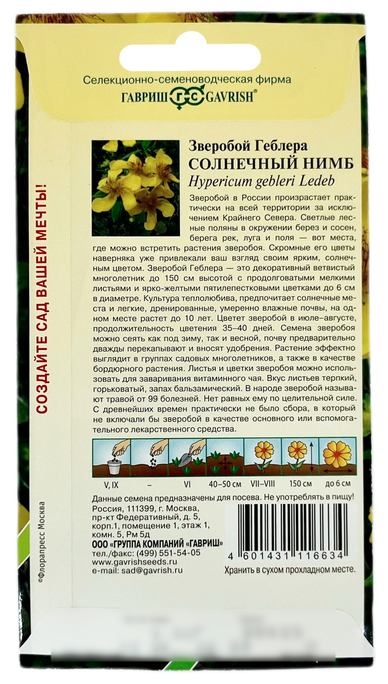 Зверобой Геблера Солнечный нимб ГАВРИШЗверобой в России произрастает практически на всей территории за исключением Крайнего Севера. Светлые лесные поляны в окружении берез и сосен, берега рек, луга и поля – вот места, где можно встретить растения зверобоя. Скромные его цветы наверняка уже привлекали ваш взгляд своим ярким, солнечным цветом. Зверобой Геблера – это декоративный ветвистый многолетник до 150 см высотой с продолговатыми мелкими листьями и ярко-желтыми пятилепестковыми цветками до 6 см в диаметре. Культура теплолюбива, предпочитает солнечные места и легкие, дренированные, умеренно влажные почвы, на одном месте растет до 10 лет. Цветет зверобой в июле-августе, продолжительность цветения 35-40 дней. Семена зверобоя можно сеять как под зиму, так и весной, почву предварительно дважды перекапывают и вносят удобрения. Растение эффектно выглядит в группах садовых многолетников, а также в качестве бордюрного растения. Листья и цветки зверобоя можно использовать для заваривания витаминного чая. Вкус листьев терпкий, горьковатый, запах бальзамический. В народе зверобой называют травой от 99 болезней. Нет равных ему по целительной силе. С древнейших времен практически не было сбора, в который не включали бы зверобой в качестве основного или вспомогательного лекарственного средства.